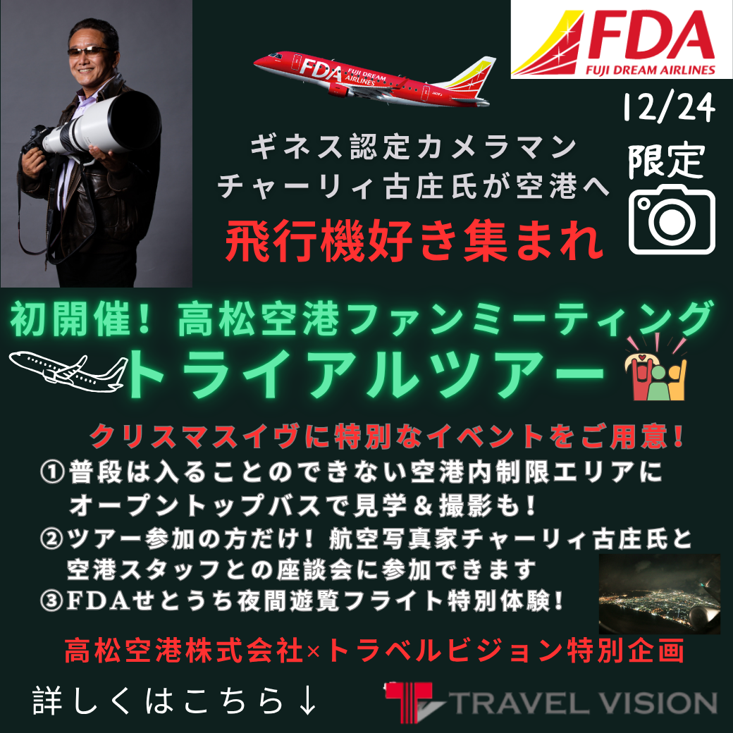 <10/27(月)10:00~発売開始>3051【高松空港発着】29,800円~高松空港㈱×トラベルビジョン特別企画【12/24発】高松空港ファンミーティングツアー ギネス認定カメラマン「航空写真家チャーリィ古庄氏」座談会&空港内制限エリアをオープントップバスで見学 日帰りツアー