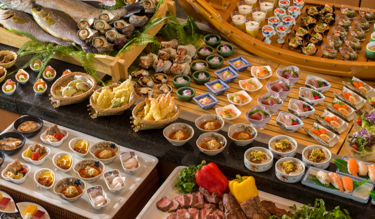 夕食は旬の刺し身はもちろんのこと鮑やサザエなども勢ぞろい!海鮮にシェフが目の前で焼く焼き立てステーキ、デザートなど40種類以上のメニューが食べ放題です。