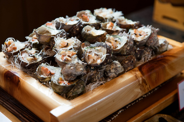 夕朝食ともバイキング料理。特に夕食は和洋中40品以上!なんと旬の刺し身は、もちろんのこと鮑やサザエなども勢ぞろい!目の前で焼き上げる牛ステーキやライブキッチンコーナーの他に伊勢志摩の郷土料理てこね寿司、伊勢うどん、スイーツまで♪