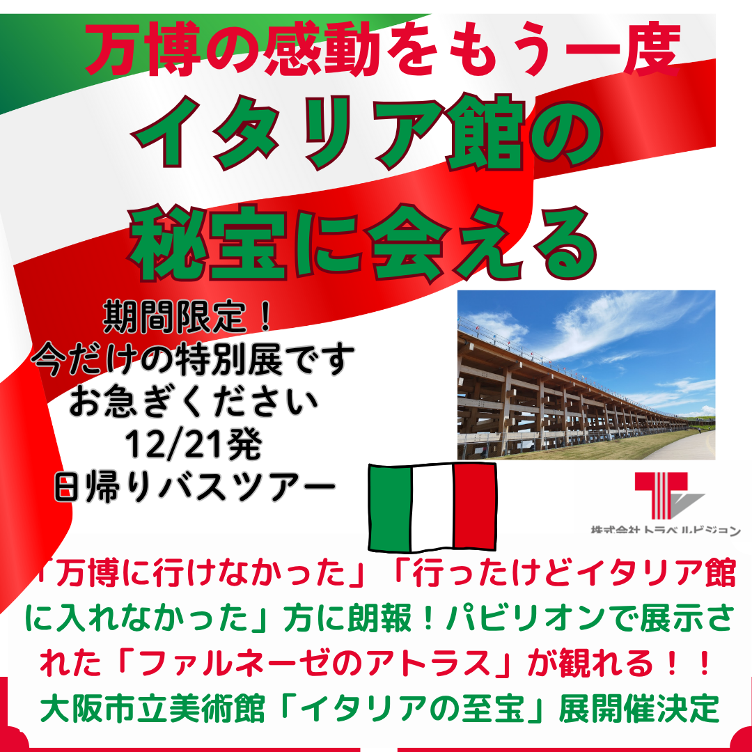 5100【宇多津~高松~津田~松茂~淡路発着】12,990円【12/21発】 あの大行列のイタリア館の目玉がここでも観れる!大阪市立美術館「天空のアトラス イタリア館の至宝」展と一粒万倍日×天赦日に行くこの日だけの大蚤の市[四天王寺大師会] 日帰りバスツアー