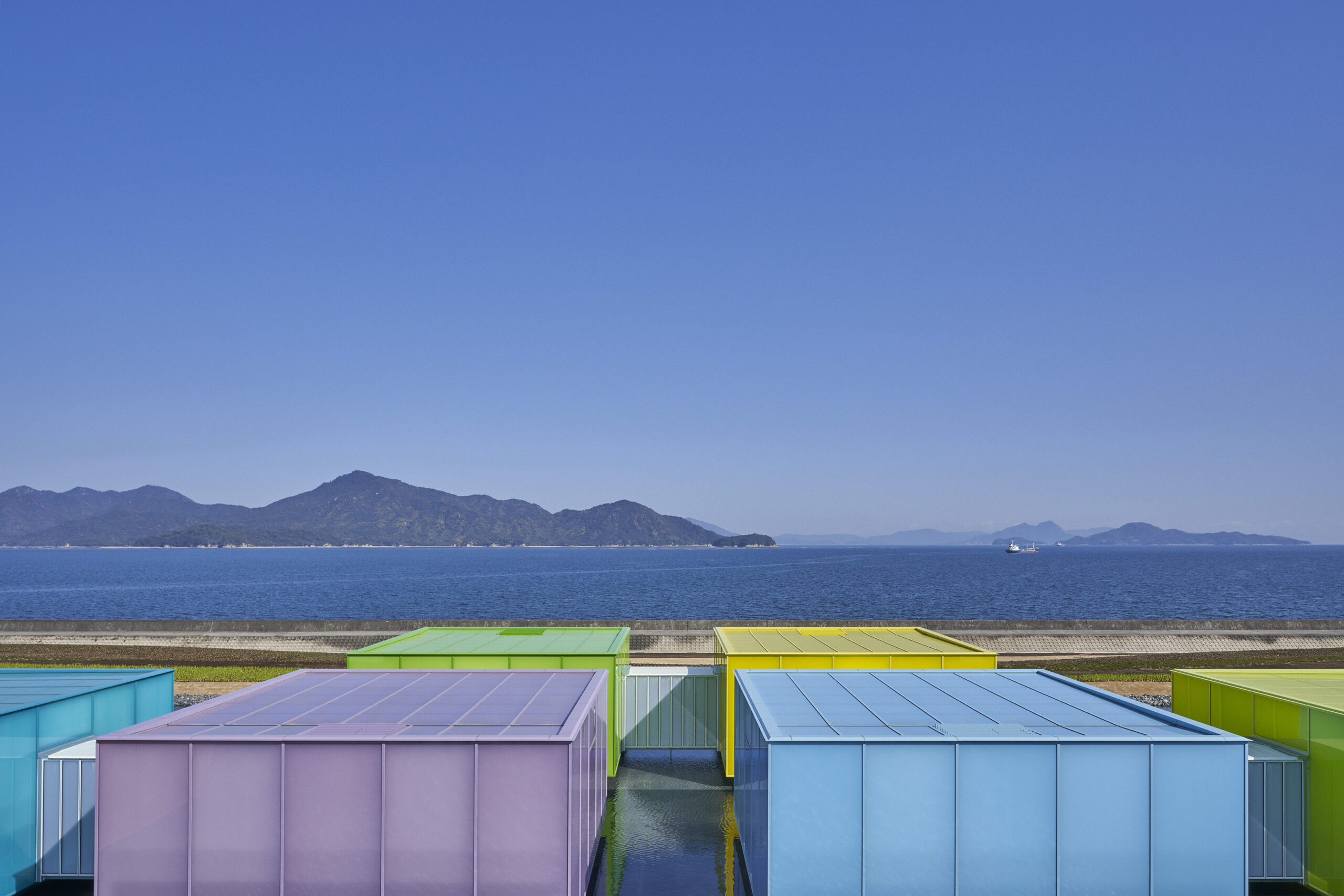 水盤に並ぶカラフルなキューブ状の展示室は外観も鮮やか。他にも瀬戸内海を望む展望テラス「望洋テラス」、季節の花が咲く「エミール・ガレの庭」も。アート作品だけでなく建物やお庭を堪能することが出来る美術館です。