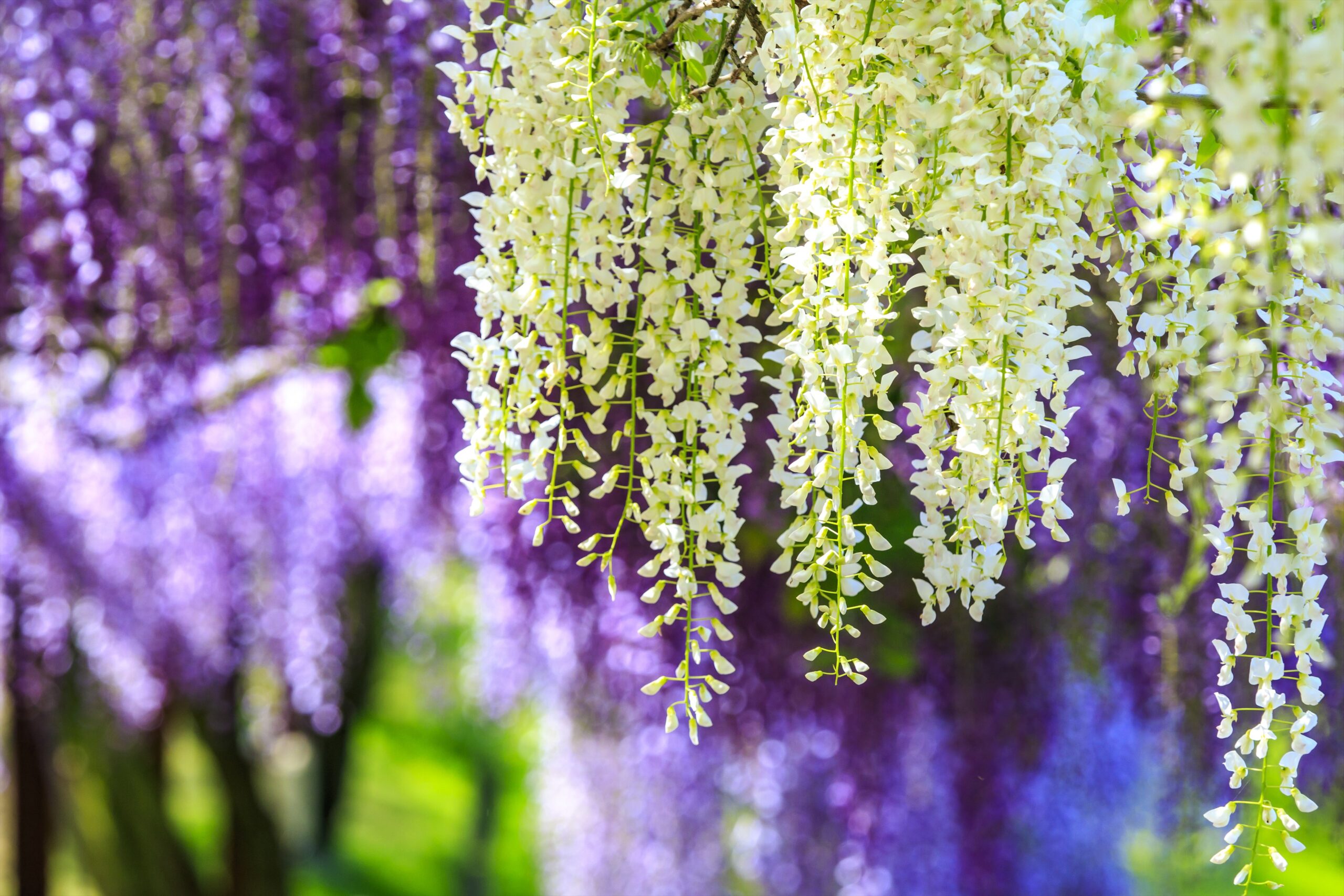 花の房を1メートルも垂らした藤もあれば、葡萄のように小ぶりな房の藤もあり、またその花の色も、紫の濃いもの薄いもの、可憐なピンクや清浄な白もありと様々です。