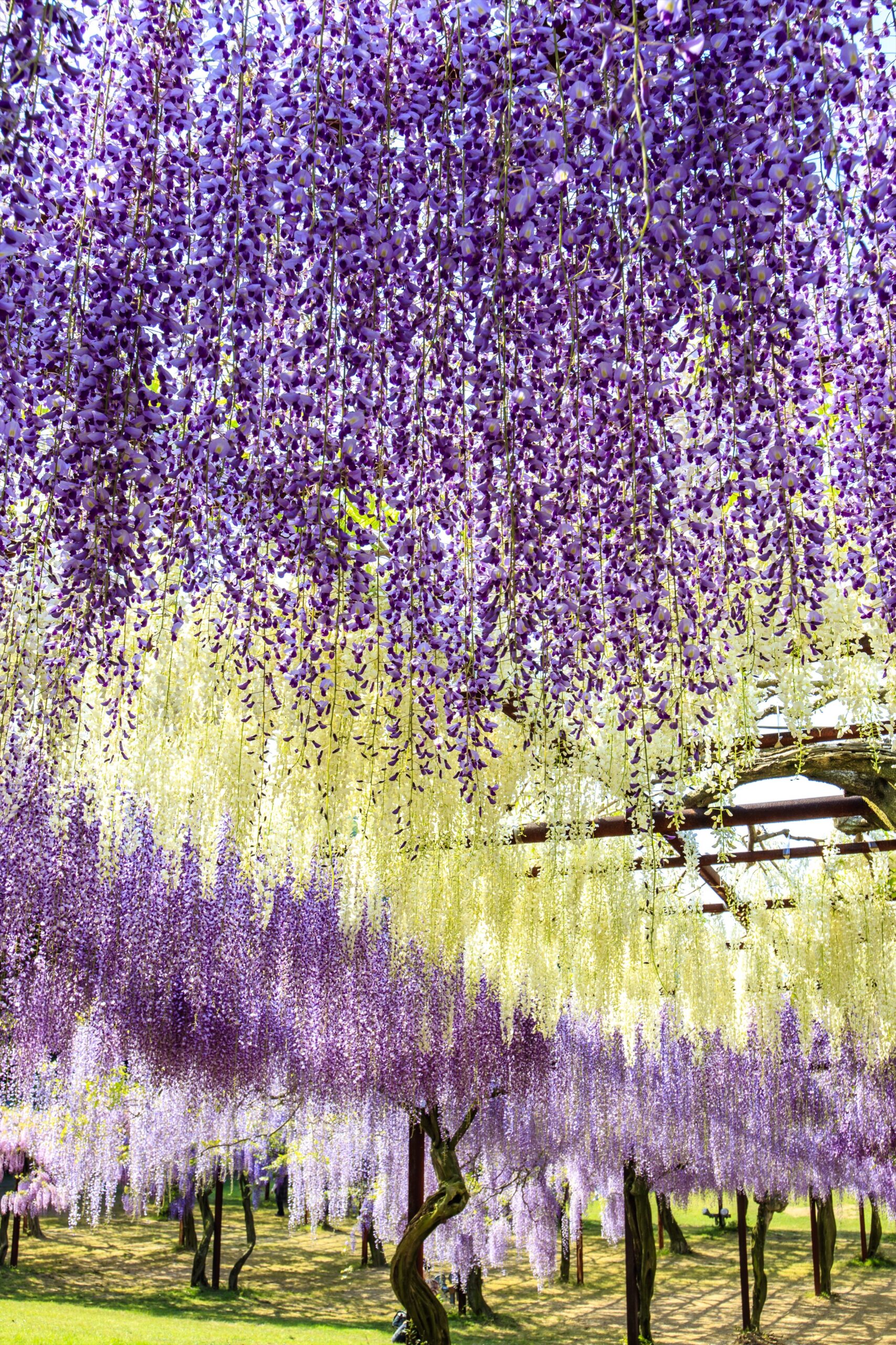 藤棚は総延長が500メートルあり、その下は通路となっていて藤を仰ぎながら散策することができます。