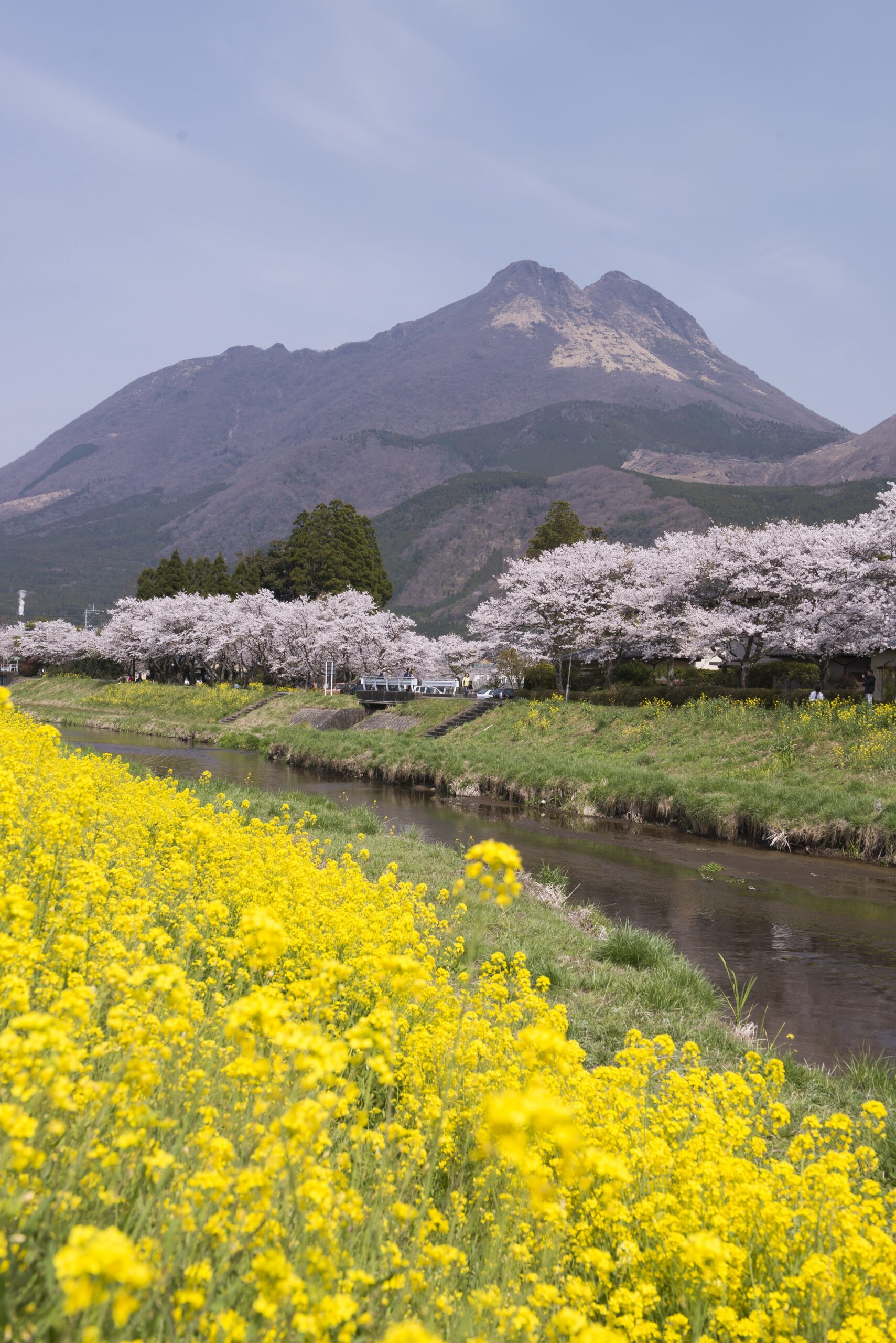 由布院の大分川沿いには桜並木が広がります。由布岳をバックに御幸橋から城橋にかけて菜の花と桜の競演が楽しめます。