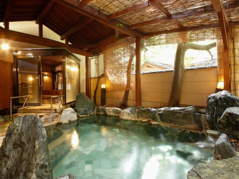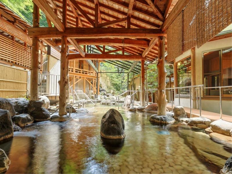 プロが選ぶ日本の名旅館100選と5つ星の宿のW受賞の名旅館大小12ヶ所のお風呂をお楽しみ!夕食は食事処でグループ様ごとに和会席をご賞味