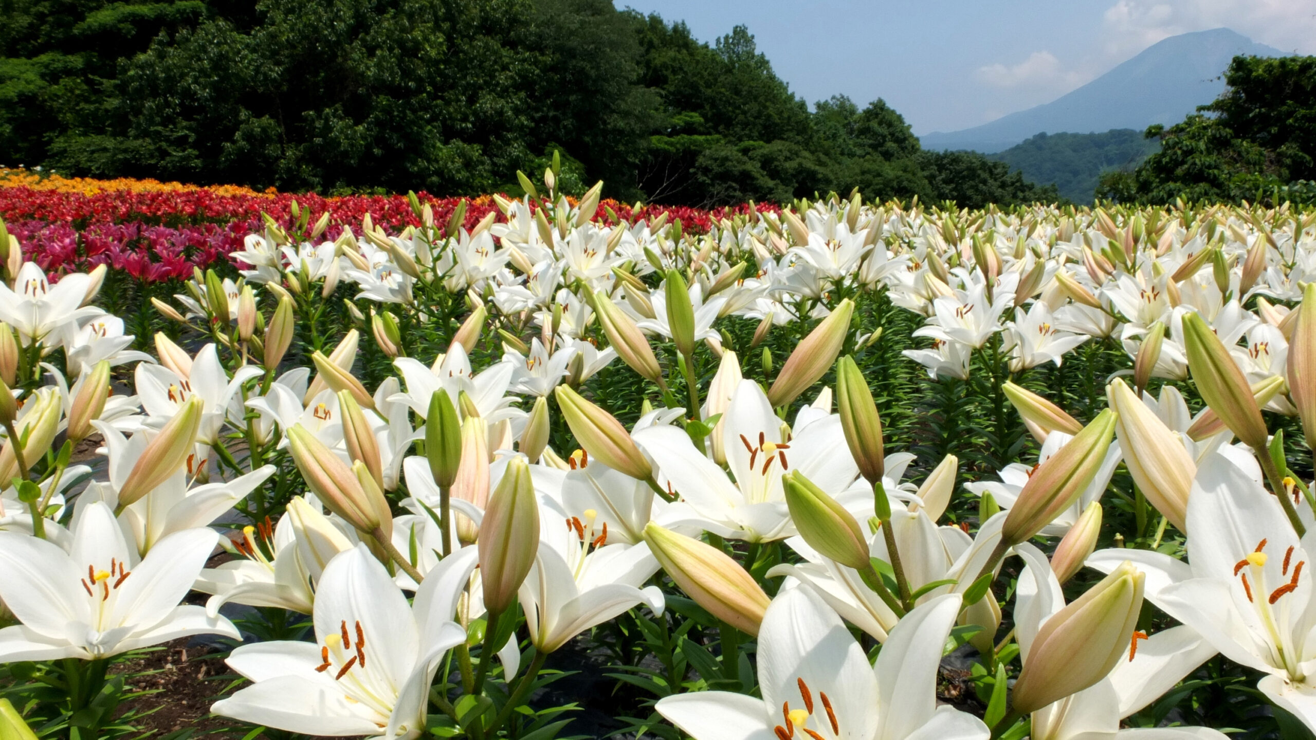 白い「ベルベデーレ」やピンク色が美しいの「チャイコフスキー」などのユリ畑が広がります。