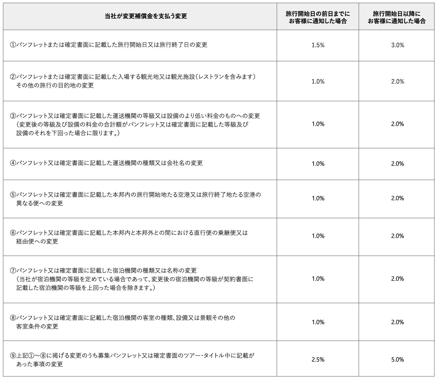 ⑴当社は、次表左欄に掲げる契約内容の重要な変更が生じた場合(ただし次の①・②・③で規定する変更を除きます。)は、第7項で定める「旅行代金」に次表右欄に記載する率を乗じて得た額の変更補償金を旅行終了日の翌日から起算して30日以内にお客様に支払います。ただし、当該変更について当社に第19項⑴の規定に基づく責任が発生することが明らかな場合には、変更補償金としてではなく、損害賠償金の全部又は一部として支払います。